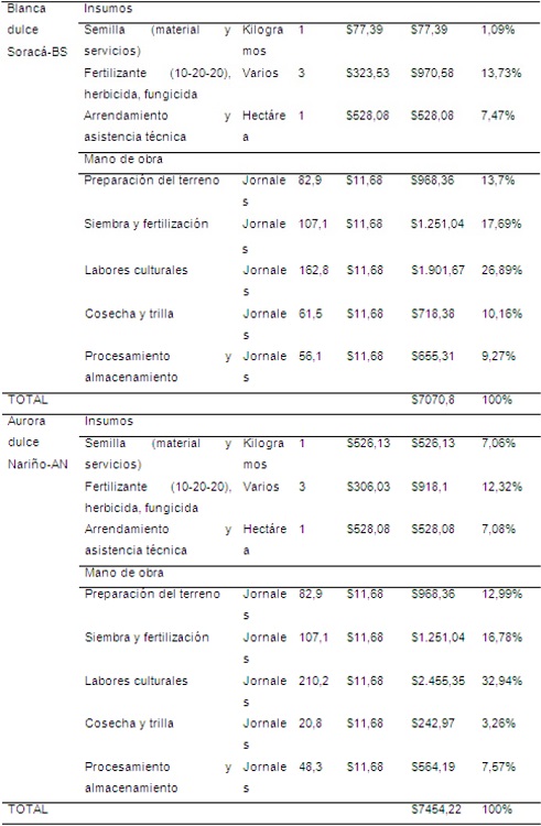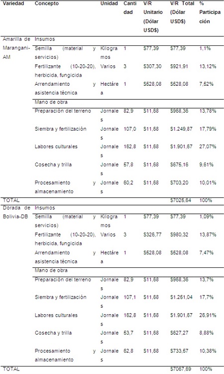 Se alcanza a percibir una variación en los costos de producción en cada una de las variedades en las labores como la cosecha, trilla del grano, procesamiento y almacenamiento respectivamente (Tabla 1), debido a las diferencias presentes en la productividad y rendimiento de cada variedad (Tabla 2).
