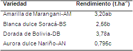Se evaluó el rendimiento toneladas por hectárea (t ha-1). Los datos obtenidos fueron evaluados mediante análisis de varianza usando el programa estadístico SAS (SAS Inst. Inc. Cary, NC), adicionalmente se realizaron pruebas de promedios comparativos por medio del test de Duncan a nivel de significancia del 5%.