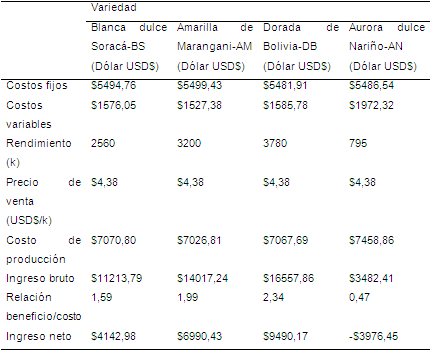 Por el modelo de análisis adoptado se puede inferir que las variedades Amarilla de Marangani, Blanca dulce Soracá y Dorada de Bolivia presentaron una alta relación beneficio costo con 1,99, 1,59 y 2,34 respectivamente, así el cultivo de quinua es una actividad rentable, siendo considerada una buena alternativa para cultivo en la región.