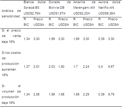 El análisis de sensibilidad tiene como objetivo evaluar el impacto generado por el cambio del precio y los rendimientos del cultivo, pudiéndose determinar cuál es la variedad de quinua más rentable frente a la fluctuación del precio de venta y cantidad de grano cosechado (Tabla 4). La variedad Dorada de Bolivia presentó un comportamiento adecuado frente a la fluctuación de los precios y caída en la producción en comparación con las otras variedades.