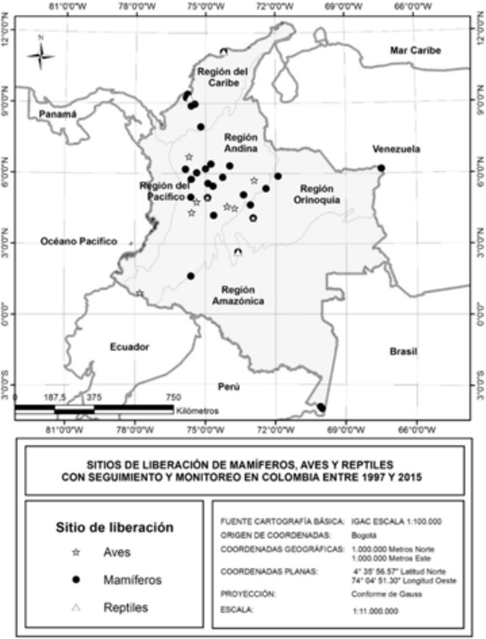 En Colombia las liberaciones de fauna silvestre rehabilitada con posterior seguimiento y monitoreo son relativamente pocas, mientras en los 66 estudios de caso evaluados entre 1997-2015 se liberaron 672 ejemplares, los informes de gestión de las CAR entre 2007 al 2013, reportan la liberación de 79.283 animales sin seguimiento y monitoreo posterior. Estos resultados evidencian que de la mayoría de animales no se conoce su destino una vez son liberados al medio y tampoco puede predecirse el impacto que estas liberaciones pueden tener sobre las poblaciones nativas.