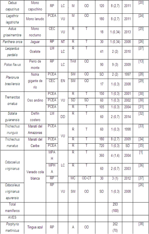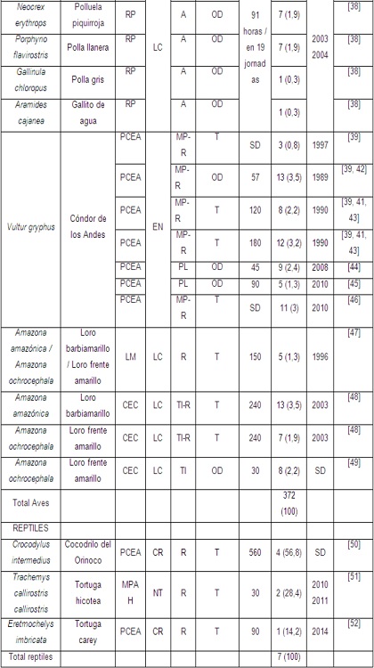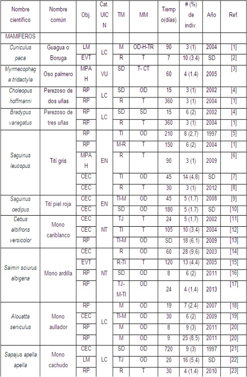 Se identificaron 66 estudios de caso, de los cuales 47 corresponden a liberaciones de mamíferos (293 ejemplares, 43,6%), 16 de aves (372 ejemplares, 55,4%) y 3 de reptiles (7 ejemplares, 1%). Los órdenes taxonómicos más representativos en mamíferos fueron Primates, Carnívora y Pilosa (51,1%, 17% y 10,6% de casos, respectivamente), en aves Cathartiformes, Gruiformes y Psittaciformes (43,8%, 31,3% y 25% de casos, respectivamente) y en reptiles Testudines y Crocodilia (66,6% y 33,3% de casos, respectivamente) (Tabla 1). Las liberaciones con seguimiento y monitoreo se han llevado a cabo solamente en especies amenazadas (ej. cocodrilo del Orinoco Crocodylus intermedius, cóndor de los andes Vultur gryphus) o que son objeto de tráfico ilegal (ej. mono cariblanco Cebus albifrons versicolor, mono cachudo Sapajus apella, titi gris Saguinus leucopus, mono nocturno Aotus griseimembra, perro de monte Potos flavus, loros Amazona spp., tortuga hicotea Trachemys callirostris callirostris).