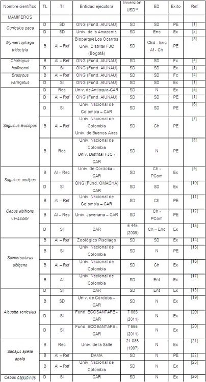 Los recursos económicos de las liberaciones evaluadas provienen de las CAR, apoyando a ONG y universidades o de las ONG que gestionan recursos para desarrollar estas actividades. Sin embargo, la mayoría de estudios evaluados (89%, 81% y 100%, para mamíferos, aves y reptiles, respectivamente) no reportan información de costos de liberación y fuentes de financiación. En liberación de mamíferos algunos estudios mencionan el monto invertido en la reintroducción (11%), y en aves el 19% (Tabla 2).