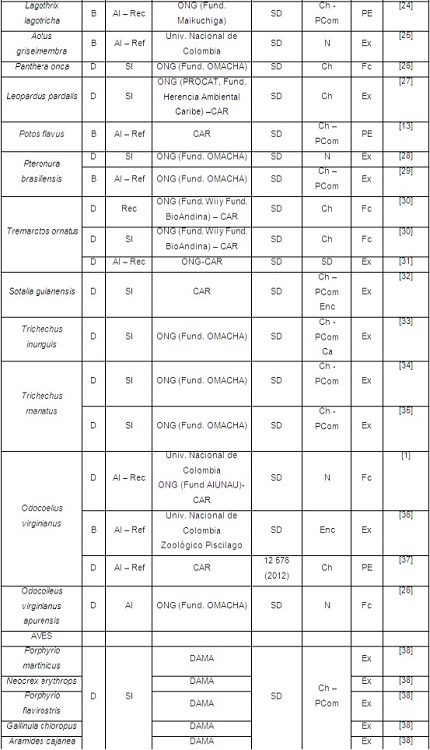 A los funcionarios de las corporaciones autónomas regionales, Unidad de Rescate y Rehabilitación de Animales Silvestres (URRAS) de la Universidad Nacional de Colombia y diversas ONG, por suministrar información valiosa para el desarrollo de esta investigación.