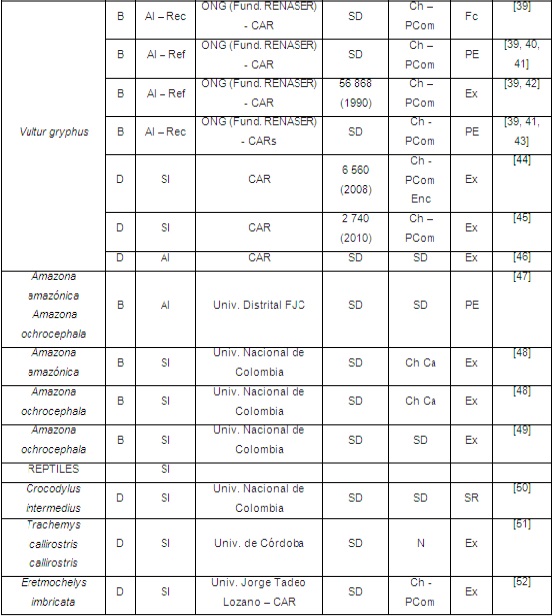 La búsqueda bibliográfica se realizó a través de las bases de datos Pubmed, Google Scholar, Web of Science, páginas web del Ministerio de Ambiente y Desarrollo Sostenible (MADS), CAR, ONG y centros de documentación de entidades que trabajan en rehabilitación de fauna en el país. Se seleccionaron estudios de caso documentados en el período 1997-2015, correspondientes a animales silvestres rehabilitados en centros de atención, valoración y/o rehabilitación de fauna silvestre (CAV), proveniente de decomisos, rescates o entregas voluntarias derivadas del comercio ilegal de fauna, o de la cría en cautiverio dentro de programas de conservación de especies amenazadas, y que fueran liberados con un posterior seguimiento y monitoreo. Adicionalmente, se revisaron 231 informes de gestión de las 33 CAR correspondientes a los años 2007 a 2013.