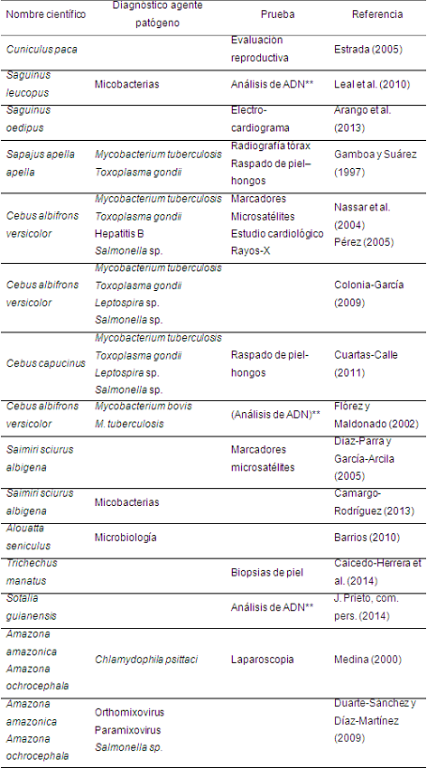 En los tres grupos taxonómicos, el 100% de los casos reportó buen estado clínico al momento de la liberación y se efectuó la evaluación etológica en la totalidad de los mamíferos y aves liberadas. El 13% de los estudios de caso de mamíferos llevaron a cabo exámenes coprológicos, hemogramas y química sanguínea; en un 38% de casos se menciona que hicieron exámenes paraclínicos, pero no especifican cuáles y en el 49% no se menciona que los hayan realizado. En el 100% de los procesos en aves y reptiles se realizaron exámenes paraclínicos aunque no se especifica cuáles fueron hechos. En mamíferos y aves se evaluaron algunos agentes patógenos con potencial zoonótico y otras evaluaciones mediante estudios complementarios de diagnóstico como electrocardiogramas, radiografías, raspados de piel, laparoscopias, entre otras. La evaluación genética sólo fue realizada en cinco casos de estudio: en mono ardilla Saimiri sciureus albigena y mono cariblanco Cebus albifrons versicolor se utilizaron marcadores microsatelites y en tití gris Saguinus leucopus, mono cariblanco Cebus albifrons versicolor y en delfín costero Sotalia guianensis no se especifica qué técnica molecular fue utilizada (Tabla 3).