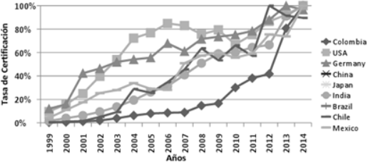 Según la encuesta ISO, para 2014 se reportaron 324.148 organizaciones certificadas en ISO 14001 globalmente; el 51,3% de estas organizaciones está localizada en países del Asia Oriental y el Pacífico; el 38,2% en Europa; mientras que sólo el 3,1% en Latinoamérica -equivalente a 10143 empresas- (ISO, 2015). Colombia ocupa la primera posición en América Latina con 3.453 certificaciones, que corresponde al 34% del total de certificaciones latinoamericanas (ISO, 2015). La adopción de la norma ha sido más lenta en los países en desarrollo (Massoud et al., 2010); como se ilustra en la Figura 1 que presenta la evolución en el número total de empresas certificadas en ISO 14001, en algunos países seleccionados. No obstante, la dinámica actual de crecimiento es exponencial, como se muestra en la Figura 2 que revela la tasa de certificación, obtenida en términos de porcentaje acumulado (ISO, 2015).