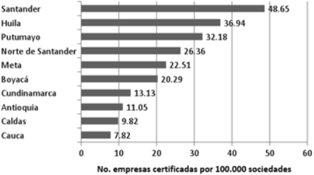 Colombia lidera la primera posición en América Latina en la certificación de ISO 14001 y tasa revela un crecimiento exponencial. A nivel departamental, se destacan las empresas de Santander y Huila con mayor número de empresas certificadas. Sin embargo, Caldas evidencia brechas en este aspecto, lo cual incide en el pilar medioambiental de los indicadores de competitividad.