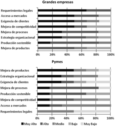 Entre las empresas certificadas en los SGA, los principales impulsores, con una calificación del 100%, considerando tanto las categorías muy alto como alto, son los siguientes: requerimientos legales, acceso a mercado, mejora de procesos y producción sostenible. Para las empresas certificadas en SGC, hay diferencias estadísticamente significativas (95%) entre los impulsores de: acceso al mercado, exigencia de clientes y requerimientos legales, que son mayores en las empresas certificadas. Finalmente, las empresas que reportan informes corporativos perciben como principales impulsores para la implementación de los SGA el acceso a mercados y la exigencia de clientes.