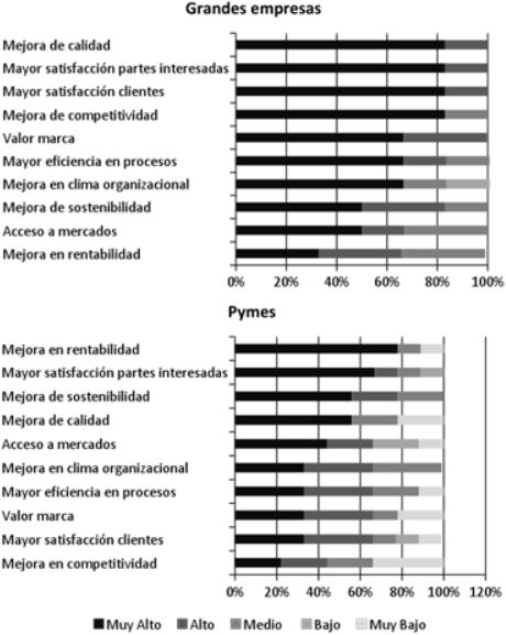 La Figura 8 resume estos beneficios considerando el tamaño de las organizaciones. Para las grandes empresas, los principales beneficios calificados en las categorías alto y muy alto (100%) se tienen: mejora de la calidad, mayor satisfacción de las partes interesadas y cliente y valor de marca. Las PYME por su parte, identifican como principales beneficios con una calificación del 78%: mejora de rentabilidad, mayor satisfacción de partes interesadas y mejora de la sostenibilidad. Hay diferencias estadísticamente significativas (90%) entre los beneficios percibidos por las grandes empresas y las PYME, que se confirman con una prueba no paramétrica, la cual revela que las grandes empresas perciben una mejora de la competitividad y una mayor satisfacción de clientes con la implementación de estos sistemas.