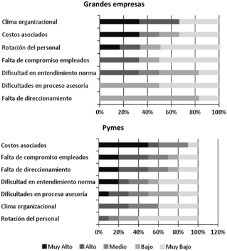 Las empresas certificadas en el estándar ISO 14001: 2004, identifican como principales barreras las siguientes: el clima organizacional (75%), la falta de compromiso de los empleados (50%), la rotación del personal (50%) y la dificultad en el entendimiento de la norma (50%), teniendo en cuenta las categorías alto y muy alto. Así mismo, en el caso de las empresas no certificadas en SGA, los costos asociados son la principal barrera identificada con un 58%. Las pruebas no paramétricas revelan diferencias estadísticamente significativas (90%), especialmente en la barrera de rotación de personal, siendo mayor en las empresas no certificadas en SGA.