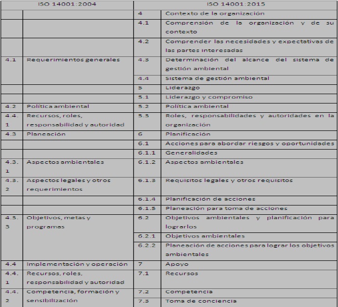 La ISO 14001 fue publicada inicialmente en 1996, con actualizaciones en 2004 y 2015. Esta última actualización tiene por objeto apoyar a las empresas en la reducción del impacto ambiental y en la comprensión de los efectos del medio ambiente en las organizaciones (International Organization for Standardization-ISO-, 2015) y dar respuesta a los desafíos ecológicos del planeta tales como el cambio climático y los riesgos ambientales (Intergovernmental Panel on Climate Change-IPCC-, 2014), que han llevado a una promoción de los programas ambientales, para lograr equilibrio entre los tres pilares de la sostenibilidad: medio ambiente, sociedad y economía (Cowan et al., 2010).
