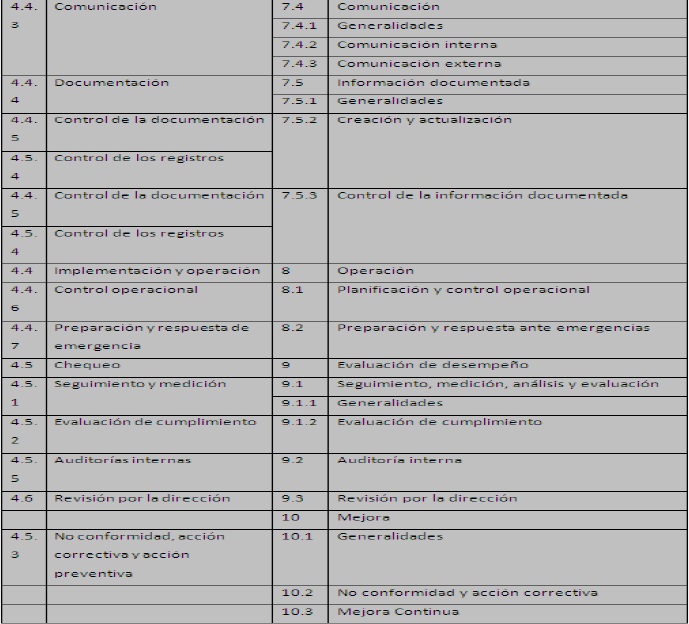 Para el estudio, se definieron las variables según los requisitos de la ISO 14001 (ICONTEC, 2004), con el fin de identificar el grado de implementación del estándar; estos requisitos de la versión 2004 se presentan en la Tabla 1 en comparación con la nueva norma ISO 14001 (ICONTEC, 2015). Se consideraron además los niveles de madurez del SGA propuestos por Lopes-de Sousa et al. (2015). Para la ejecución del estudio, se realizaron visitas a las industrias y se aplicaron las herramientas e instrumentos de recolección de información primaria (previamente validados en prueba piloto) por entrevistas estructuradas a los responsables del SGA; para tal efecto, se tuvieron en cuenta los lineamientos de auditoría del SGA, con los siguientes criterios de evaluación:1) Inexistente: No existe actualmente en la organización; 2) Establecido: La manera de realizarlo ha sido definida por la organización, pero no está documentado; 3) Documentado: Escrito en cualquier medio o formato; 4) Implementado: Se realiza de acuerdo con lo escrito y se han hecho mejoras. El nivel de avance fue cuantificado de manera porcentual.