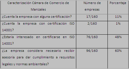 Results: Statistics shows that Colombia leads the ISO 14001 certification in Latin America. However, adoption rates are relatively low compared to developed countries. Nationwide, the Department of Santander has the best indicators regarding ISO 14001 certified companies, while the Department of Caldas ranks in the ninth position. For the companies evaluated in the Department of Caldas, only 25% were certified to the standard. Statistically significant differences, regarding the industry size, the standard implementation level and driving forces, barriers and benefits of EMS were found.