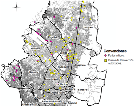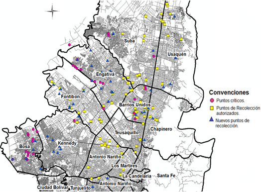 La Secretaria Distrital de Ambiente identificó diferentes puntos críticos de acumulación de llantas usadas en Bogotá en 2016. Estos puntos se encuentran mayormente distribuidos en las localidades de Engativá, Bosa y Barrios Unidos. Por su parte la ANDI estableció más de 96 puntos de recolección mediante el programa de gestión de devolución de productos posconsumo Rueda Verde. Con base en ello la figura 9 muestra la distribución espacial de los puntos críticos y los puntos de recolección autorizados, evidenciando que en las localidades donde hay una mayor tendencia de generación de llantas usadas no se tiene una relación entre estos puntos.