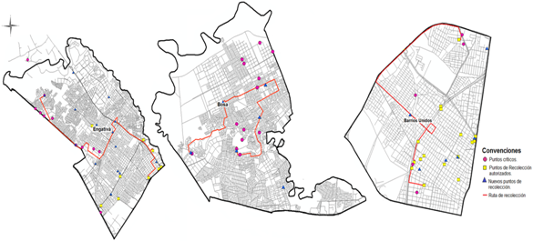 Para la localidad de Engativá se obtuvo una ruta de 13 km con un tiempo de recorrido de 39 minutos. Para su trazado se tuvo como parte primordial el suroriente de la localidad, ya que es la zona más crítica; del mismo modo se utilizaron dos puntos de recolección autorizados y dos nuevos puntos de recolección. Es importante mencionar que se priorizaron las zonas con mayor densidad de puntos críticos para el trazado de esta ruta. Para la localidad de Bosa se estableció una ruta de 9 km con un tiempo de recorrido de 40 minutos. La ruta abarca gran parte del área de la localidad con cinco nuevos puntos de recolección, ya que en esta localidad se encuentran diversos puntos autorizados. Por último, para la localidad de Barrios Unidos se trazó una ruta de 7 km con un tiempo de 18 minutos. Para esta localidad, a pesar de que se establecieron nuevos puntos de recolección, se utilizó solo uno debido a que los otros tres puntos de la ruta son puntos autorizados.