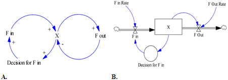 La dinámica de sistemas es una metodología para el análisis y resolución de problemas, desarrollada por Jay Forrester (1999) presentada en diferentes publicaciones. En dinámica de sistemas se concibe cualquier aspecto del mundo como la interacción causal entre atributos que lo describen. De esta forma se construyen representaciones sistémicas con flechas y puntos, denominadas diagramas causales, que capturan todas las hipótesis propuestas por el modelador (Ibarra y Redondo, 2015). Para la construcción de modelos de simulación se sigue un proceso sistémico (Redondo et al., 2018). A continuación, se describen los pasos para la construcción del modelo: inicialmente se parte de la conceptualización y la hipótesis dinámica, la cual se sintetiza en el diagrama causal del modelo (figura 2A). Posteriormente se construye el diagrama de niveles y flujos, y se obtienen las ecuaciones que constituyen el modelo matemático que representa la situación. En la figura 2B se muestra un modelo que representa una situación en la que hay una variable de estado X, a la cual se asocian dos variables de flujo: una de entrada (F in) y una de salida (F out), con una variable auxiliar o de decisión que permite el cálculo de flujos.