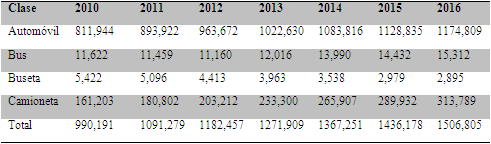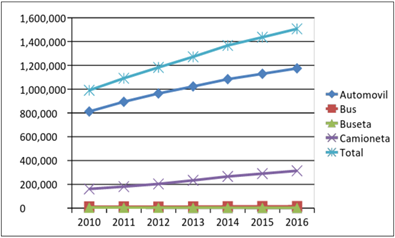 El parque automotor de la ciudad de Bogotá ha tenido una dinámica de crecimiento con una tasa mayor a la del crecimiento de su población. De acuerdo con la información reportada por la Secretaría Distrital de Movilidad, entre 2010-2016, la tasa de crecimiento de vehículos ha oscilado entre el 4,5 y el 9 %. Para la alimentación y validación del modelo se tomó como base la información registrada de cuatro clases de vehículos, que representan el 75 % del parque automotor de la ciudad (SDM, 2016). La tabla 1 muestra la información de los vehículos utilizados en el modelo. La figura 4 plantea los datos graficados de la tabla 1, los cuales evidencian un crecimiento exponencial del parque automotor seleccionado.