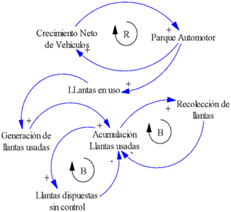 El bucle B de la derecha representa la cantidad de llantas que se recolectan en función de la cantidad de llantas acumuladas, lo que está relacionado de manera directa con la generación de llantas provenientes del parque automotor. De igual manera representa la cantidad de llantas que se pueden disponer sin control, en función de la acumulación de llantas usadas.