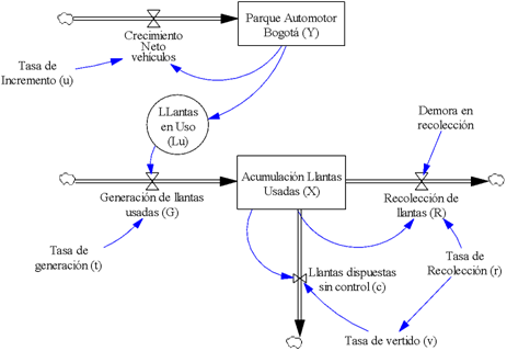 R representa el flujo de recolección de llantas que depende de una tasa de recolección (r) y un tiempo de demora. El modelo matemático propuesto es el siguiente: