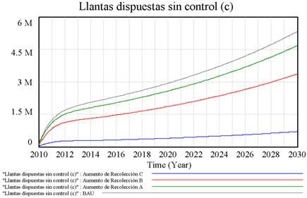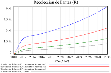 Para la simulación del modelo se utilizó el método de Euler establecido por el software utilizado: se tomó como tamaño de paso de simulación a 0,0625; la unidad de tiempo fue años y el tiempo de simulación fue entre 2010-2030. Se establecieron cuatro escenarios de simulación distintos que permitieron la comprensión del comportamiento del sistema bajo la variación del parámetro tasa de recolección de llantas. En los escenarios obtenidos se evidencian: el cambio de la recolección de llantas y la cantidad de llantas dispuestas sin control bajo los escenarios simulados. Los escenarios fueron: escenario inicial BAU; escenario A con eficiencia de recolección del 30 %; escenario B con una eficiencia de recolección del 50 % y escenario C con una eficiencia de recolección del 90 %.