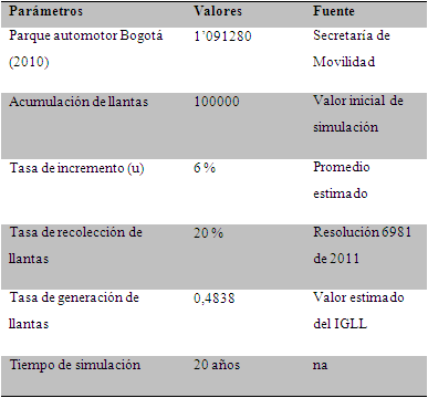 Para la simulación del modelo propuesto se tuvo en cuenta los datos reportados del parque automotor de la clase de vehículos seleccionados. De igual manera se estimó una tasa de generación de llantas usadas de las cuatro clases de vehículos con base en el índice de generación de llantas usadas (IGLL( de la Secretaría Distrital de Ambiente de Bogotá. Los parámetros empleados para el escenario base de simulación (BAU( (por sus siglas en inglés Business as usual) se presentan en la tabla 2.