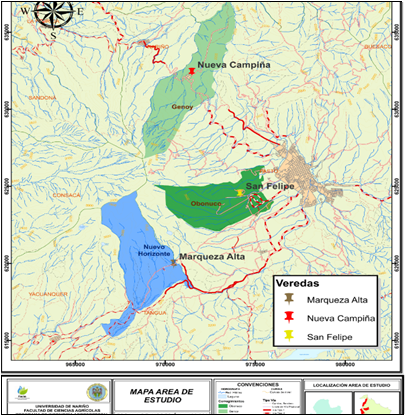 El estudio se realizó con adultos de las zonas Nueva Campiña y San Felipe del municipio de Pasto y Marqueza del municipio de Tangua, situadas a 2800 y 3100 m s. n. m. respectivamente, con una temperatura promedio de 12 °C (fig. 1). Distan de la ciudad de Pasto a 12,5 y 10 km; con uso del suelo principalmente agrícola y pecuario, y en menor proporción para el turismo (Cadena, 2013).