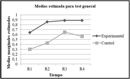 Lo anterior, se respalda con la prueba de efecto intersujetos en la que se obtuvo que para el test general la F univariada 809,689 es significativa (p=0,00 < 0,05); por tanto, se presenta un efecto de interacción entre el tiempo y el tipo de materiales empleados que explica parte de la varianza (figura 2).