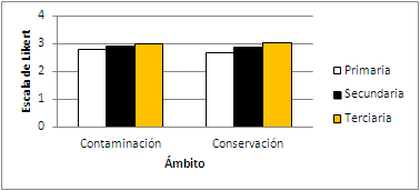 ABSTRACT: The aim of the present study was to analyze and understand the way in which as-sessment both cognitive and affective elements (contextual and personal) condition the behavior of primary, secondary and tertiary education students with their environment. The guid¬ing questions were: What is the assessment that students of different levels of education give to environmental issues? Is there any difference in the assessment of students between the contamination and the preservation scope within environmental variables? The environmental scale of attitudes by Moreno et al., (2005) was applied to 367 students for the attitudinal analysis. An adequate internal consistency of the Scale, α Cronbach = 0,776 was confirmed. It was detected that the greatest differences occurred in the attitudinal variables corresponding to the personal framework and the smallest differences occurred in the variables of the contextual scope. The results were relevant because they indicated that the variables belonging to the contextual scope are the ones that must be reinforced which can be materialized by strengthening the Curriculum through the emphasis in environmental education. The highest assessment of the environmental variables occurred differentially in students of tertiary, secondary and primary education respectively. The same tendency was observed in the attitudinal variables, detecting in its interior that the contextual scope obtained the lowest assessment in the three educational levels.