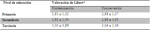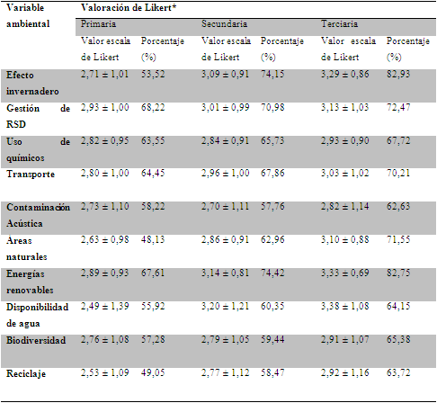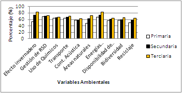 Al clasificar las variables ambientales de la escala como los porcentajes de la suma de las categoría ‘bastante’ y “mucho o totalmente” se encontró que la población encuestada conocía de manera general los problemas ambientales en ambos ámbitos, detectando que las preguntas del bloque de conservación presentaron un mayor valor promedio en la escala de Likert que las preguntas del bloque de contaminación en los tres niveles de educación; no obstante, la diferencia no fue significativa (p > 0,01) (tabla 1, figura 1). En el bloque de conservación destacaron los temas de áreas naturales y energías renovables; en el bloque de contaminación los tópicos de efecto invernadero, gestión de RSD y transporte alcanzaron los más altos porcentajes de respuestas; es importante destacar que en educación primaria las variables reciclaje, áreas naturales y efecto invernadero fueron las que alcanzaron los porcentajes más bajos de respuestas (tabla 2, figura 2).