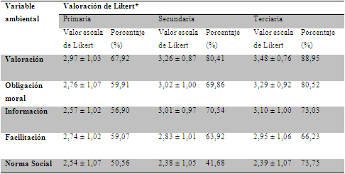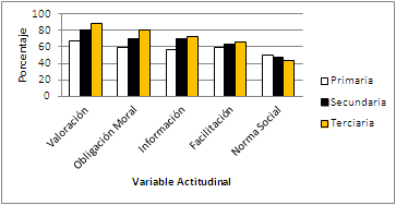 Al clasificar las variables actitudinales de la escala como los porcentajes de la suma de las categoría ‘bastante’ y “mucho o totalmente” se detectó que las correspondientes al marco personal (valoración y obligación moral) fueron las que alcanzaron los más altos porcentajes en los tres niveles educativos (tabla 3, figura 3).