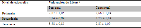 Al comparar el grado de acuerdo de las preguntas del ámbito personal con las del ámbito contextual se detectó que las primeras obtuvieron una mayor valoración que las segundas en los tres niveles educativos (tabla 4, figura 4) (diferencia estadísticamente significativa t (α=99, gl=366)= 5,754, p < 0,001), esto demuestra que existe una sensibilidad ecológica subjetiva latente dado que se reveló una actitud de alta valoración del tema ambiental.