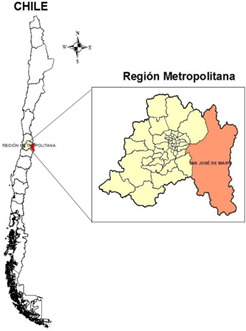 El estudio se realizó en la comuna de San José de Maipo, ubicada en la Región Metropolitana, Provincia Cordillera, en el sector Sur Oriental, a los 70° 20’ de longitud oeste y los 33° 39’ de latitud sur (Figura 1). La comuna se encuentra a unos 48 kilómetros de Santiago, la Capital de Chile (PLADECO, 2010). Por las particularidades del territorio, la Región Metropolitana posee una condición de importancia que la sitúan dentro de los 34 hotspot (puntos calientes) de biodiversidad mundial (Figura 1) (Gobierno Regional Metropolitano de Santiago, 2014)