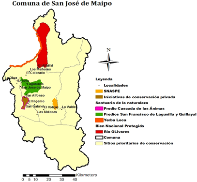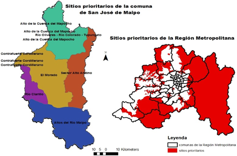 En la Región Metropolitana se encuentran distintos sitios prioritarios para la conservación biológica, estos sitios se ubican en zonas de alta montaña, piedemonte andino, cordillera de la Costa, quebradas y algunas áreas bajas del valle central (Gobierno Regional Metropolitano de Santiago, 2014). El total territorio de la comuna de San José de Maipo está compuesto por distintos sitios prioritarios (Figura 2).