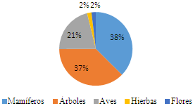 En la figura 4 podemos ver cómo los mamíferos corresponden el elemento más mencionado por los entrevistados (38%), aunque por muy poca diferencia respecto a los árboles. Luego fueron mayormente nombrados los árboles (37%) y después las aves (21%), en muy poco porcentaje fueron mencionadas hierbas (2%) y flores (2%).