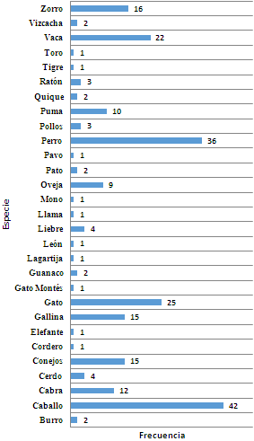 Mamíferos mencionados: dentro de los mamíferos, los más mencionados fueron el caballo (Equus caballus), seguido por el perro (Canis lupus familiaris), gato (Felis catus) y vaca (Bos taurus) (Figura 5). De los animales nativos de la comuna fueron mencionados el guanaco, puma y zorro (Figura 5).