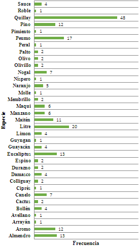 Árboles mencionados: respecto a los árboles más nombrados, en primer lugar, se encuentra el quillay, el cual tiene una significancia muy alta para los habitantes de la comuna ya que fue mencionado casi por todos como un árbol sagrado que no se debe cortar y que está en peligro. A continuación del quillay fueron también bastante mencionados el Litre (Lithraea caústica) y el Peumo (Cryptocaria alba) (Figura 6). La mayoría de las especies nombradas son nativas, por lo que se puede decir que los entrevistados poseen conocimiento de los árboles nativos de su territorio.