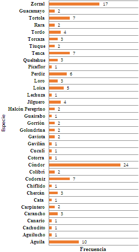 Aves mencionadas: el cóndor fue el ave más mencionada, como se puede ver en la Figura 7, las personas describen al cóndor como un ave emblemática de la comuna, ya que su observación atrae turistas, también mencionan que se encuentra en peligro de extinción. Luego del cóndor fue mencionado el zorzal (Turdus philomelos) y el águila (Geranoaetus melanoleucus) reiteradas veces (Figura 7). Fueron nombradas diversas especies que se observan en el territorio.