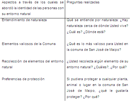 Para evaluar la relación de las personas con la naturaleza se abordó la identidad de las personas con su entorno. Las preguntas se enfocaron en obtener información sobre qué entienden las personas por naturaleza, qué elementos de la comuna les resultan valiosos, si recolectan algún elemento del entorno natural y preferencias de protección (Berghoefer et al., 2010). Las preguntas realizadas en función de cada aspecto se presentan en la tabla 1.