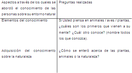Para el caso de este estudio, los elementos del conocimiento correspondieron a aves, mamíferos, árboles, hierbas y flores (Berghoefer et al. 2010). Respecto a la adquisición del conocimiento que las personas poseen se indagó sobre cómo las personas adquirieron ese conocimiento. La Tabla 2 presenta los aspectos evaluados para determinar el conocimiento de las personas de su entorno natural y las preguntas realizadas.