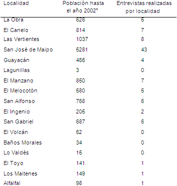 De acuerdo a los criterios anteriormente mencionados, la población muestreada de la comuna de San José de Maipo correspondió a 96 personas escogidas de forma aleatoria a través de un muestreo estratificado de las distintas localidades que componen la comuna. Las encuestas fueron aplicadas por la primera autora del artículo más dos estudiantes universitarios debidamente preparados. Las entrevistas fueron realizadas puerta a puerta. Las personas estaban muy dispuestas a responder la entrevista, les gustaba participar y opinar sobre su comuna. Las entrevistas fueron aplicadas en noviembre del año 2015.
