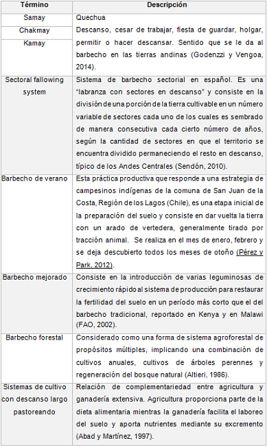 Etimológicamente la palabra “barbecho” proviene del latín vervactum (ver: veris primavera-verano y actum: participio del verbo agere), que significa "acto hecho para la primavera-verano" (Pérez y Park, 2012). Este término corresponde al término inglés fallow y al término francés jachère (Morlon, 1992). Otros sistemas similares son el openfield en Europa, que funcionó en épocas pasadas hasta el siglo XVIII y las técnicas de rotación o de intercambio de trabajo que se designan en una porción del territorio ya sea manejada comunalmente o por sectores en América, con varios nombres según el idioma y la región (Hervé, Genin y Riviere, 1994) (Tabla 1).