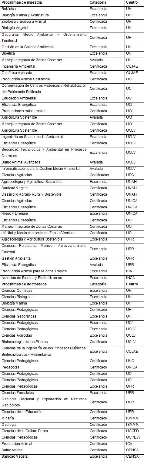 Se satisfizo en más del 90 % las demandas de capacitación y postgrado solicitadas por entidades nacionales y territoriales. Los programas académicos de Maestría y Doctorado están certificados y avalados como de excelencia por la Junta Nacional de Acreditación, tal y como muestra la tabla 1.