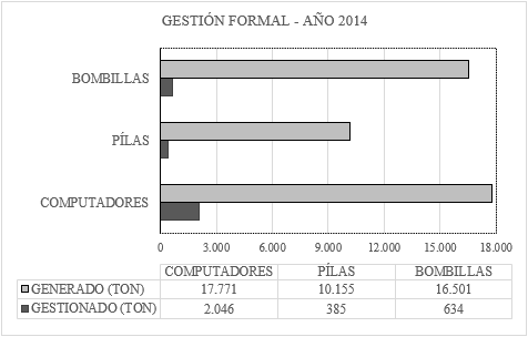 En el caso de Colombia, solo 3 subcategorías de Aparatos Eléctricos y Electrónicos (AEE), –que representan el 14,9% del total de importaciones– están reguladas y son gestionadas a través de sistemas formales (MADS, 2016). Sin embargo, las cantidades recolectadas a través de estos sistemas no son significativas. Específicamente en Bogotá, la Secretaría Distrital de Ambiente reveló que en 2010 se generaron 21.959 toneladas de RAEE, de las cuales tan solo 1.400 (6%) fueron tratadas por empresas autorizadas (MADS, 2017a).