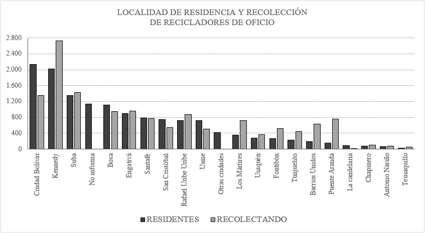 En cuanto a su presencia en las diferentes localidades de la ciudad de Bogotá, según el censo de 2012 las localidades con mayor presencia de recicladores fueron: Kennedy (2.728), Suba (1.431) y Ciudad Bolívar (1.348). A este respecto, se encontró que no necesariamente la localidad de residencia del reciclador corresponde con aquella en la que se trabaja, como en el caso de la localidad de Kennedy que tiene un mayor número de recicladores trabajando con respecto a los recicladores residentes y Ciudad Bolívar donde se presenta el caso inverso (figura 2). Esto puede deberse a la cantidad y calidad de material que una zona brinda (Usaquén) o que en dicha localidad se encuentran más o mejores lugares para la comercialización del material (Kennedy).