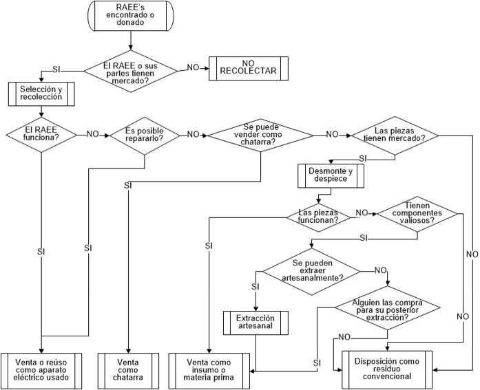 Es necesario señalar que el sector informal constituye el primer eslabón de la cadena de manejo de RAEE (recolección y desmonte), pero una vez se asciende, aparecen empresas semiformales y formales para el aprovechamiento. Como regla general, el flujo de componentes valiosos recogidos por los recuperadores informales llega hasta los gestores formales nacionales e internacionales para su aprovechamiento y recuperación. Este es un aspecto inevitable, debido a que el sector formal cuenta con la infraestructura para realizar el aprovechamiento y con el poder adquisitivo para comprar grandes volúmenes de RAEE, lo que no sucede con el informal que se ve limitado por la escasez de recursos (Rodríguez et al., 2010).