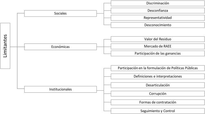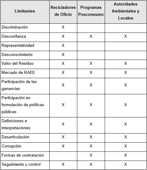 Con el fin de entender la dinámica y proponer una solución integral a la gestión de RAEE en la ciudad, en esta sección se presentarán las limitantes identificadas como resultado de contrastar las diferentes opiniones, percepciones y posiciones de los actores en la gestión de RAEE en Colombia, recicladores de oficio, organizaciones de recicladores, programas posconsumo y autoridades ambientales.