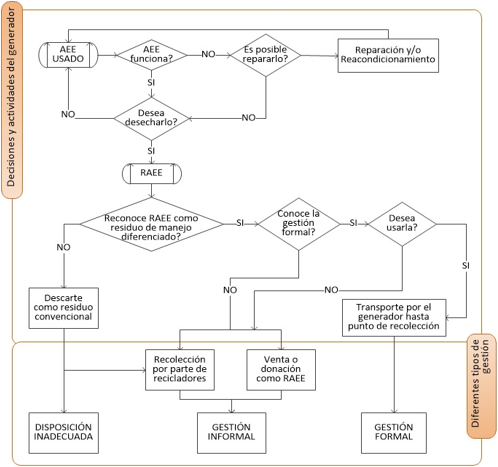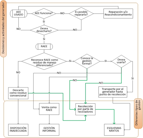 En Bogotá D.C, la cadena de gestión informal empieza con la entrega del RAEE, por parte del generador, a los recicladores. Este generador puede esperar algún tipo de contraprestación, como es el caso de residuos de neveras, computadores, celulares, hornos microondas u otro tipo de residuos que tenían, cuando estaban en uso, un alto valor comercial; por esta razón, en muchos casos el reciclador termina pagando por el residuo o el generador termina almacenando dicho residuo por tiempo indefinido. Los demás residuos que tienen poco o ningún valor, como cables, pilas, y bombillas son entregados al reciclador o dispuestos con los residuos convencionales. Aquellos RAEE que no tienen mercado o que su valor es muy bajo, tienden a no ser recolectados, al no compensarse el esfuerzo de su recolección.