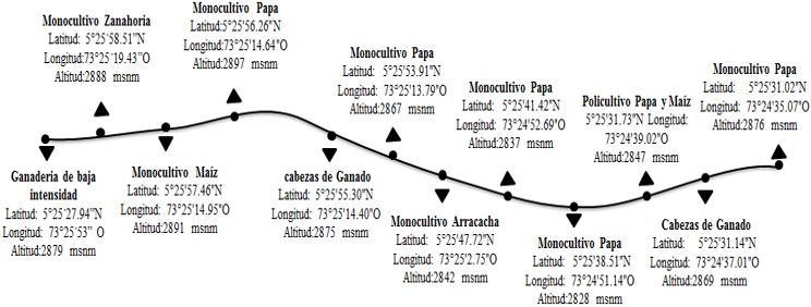 Sumado a lo anterior, por medio del corte transversal (figura 1) se identificaron las características de las prácticas agrícolas desarrolladas. La mayoría de cultivos se desarrollan bajo monocultivo que comprende extensiones de tierra desde 0.5 ha hasta 1.5 ha. Sin embargo, se evidencia implementación de policultivo en extensiones de tierra más reducidas, estos cultivos son para el sustento de las familias, ya que según la comunidad para los cultivos que tienen como finalidad ser comercializados no resulta rentable hacer combinación de productos, debido a que se presentan pérdidas económicas pues “no todos los cultivos tardan el mismo tiempo en estar listos para cosechar” (Entrevistado 36, comunicación personal, diciembre de 2017), los agricultores afirman que “si se siembra papa con arveja, al momento de sacar la papa la arveja se ve afectada ya que la arveja se demora aproximadamente un mes más que la papa y es ahí donde se pierde la plata” (Entrevistado 41, comunicación personal, diciembre 2017), esto es contradictorio con lo que afirma Norman (1977) quien dice que la rentabilidad económica neta de los policultivos es mayor que la de los monocultivos que crecen en áreas equivalentes. Se evidenciaron prácticas de ganadería de baja intensidad, la cual tiene como fin la producción de leche y carne. Se ordeña dos veces al día, de las cuales se obtiene en promedio de 5 a 7 litros/vaca/día, lo cual les aporta un ingreso de $750/litro; asimismo, el ganado es usado para la producción de carne, la cual se efectúa mediante un intermediario que se acerca a la vereda a realizar la compra del ganado, el cual tiene un valor de $80.000/arroba.