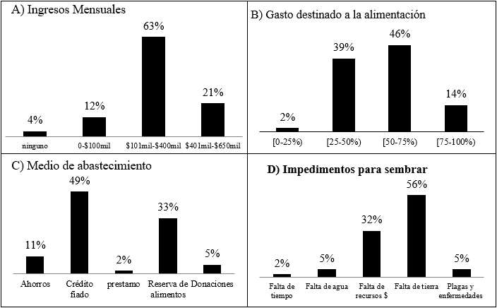 También se pusieron en consideración el conjunto de indicadores propuestos por la FAO (2015) que miden las dimensiones de la seguridad alimentaria a fin de permitir una evaluación integral. A continuación, se presentan los aspectos de las dimensiones de acceso y disponibilidad de alimentos. Se analizaron los ingresos mensuales (figura 2A), se observa que el 63% de la población cuenta con ingresos económicos que van desde $101.000 hasta $400.000, esto concuerda con las estadísticas del DANE (2015), en las cuales se establecen que los ingresos per cápita promedio para el año 2014 para los habitantes de las zonas rurales del país eran de $240.035. Los ingresos económicos son un determinante del acceso de alimentos e indirectamente de la seguridad alimentaria, porque dependiendo de la capacidad de compra que tenga cada persona, se hace posible llevar una alimentación adecuada (MINSALUD, 2015). Otro factor que influye en la seguridad alimentaria es el índice de precios al consumidor (IPC), debido a que este condiciona la cantidad de alimentos que se adquieren. La variación de IPC durante lo recorrido del año 2018 ha sido del 2.05%, el costo de los alimentos presenta un alza del 0,66%, por este motivo si se compara el valor de la canasta básica ($1.250.000-1.350.000) entendiendo que está constituida por alimentos, productos higiénicos, de salud y educativos, con el ingreso promedio mensual de los habitantes de la vereda, se evidencia que la población se encuentra por debajo de la línea de pobreza, la cual se entiende como el nivel mínimo de ingreso con el cual una persona podría satisfacer sus necesidades básicas, generando una alta vulnerabilidad a presentar inseguridad alimentaria.